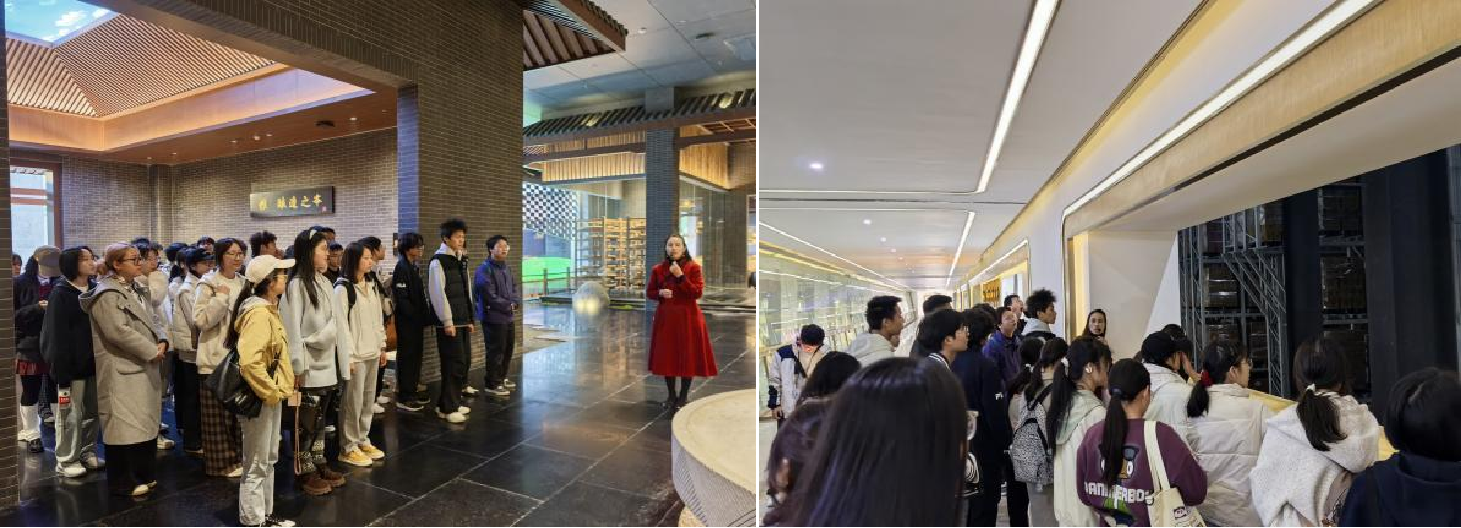 在千禾味业食品股份有限公司,同学们在工作人员的讲解下,有序参观了酱油、食醋等生产线,在古法酿造区、现代生产车间深入了解了传统酿造工艺与现代技术的创新融合。从传统陶缸的小批量发酵到现代化的规模生产,从依赖经验到科技驱动,同学们不仅开阔了眼界,对食品行业传统技艺的坚守与革新有了更深的了解,生动感受了行业发展的脉搏。