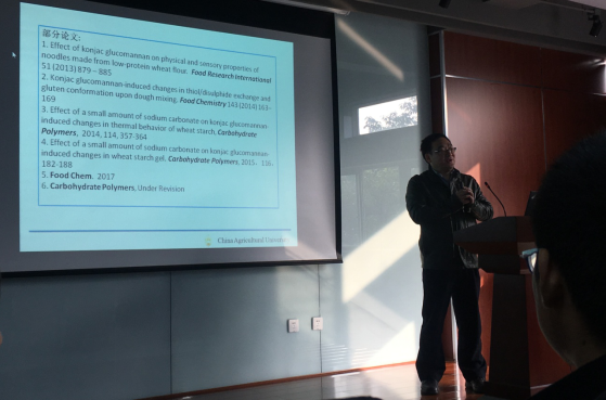 2017年12月4日上午9时,中国农业大学程永强教授来成年人电影 开展“魔芋葡甘露聚糖与面团各组分相互作用及对产品功能影响”学术报告,食品工程系何强教授、吕远平教授、迟原龙副教授、赵志峰副教授、卜迁副教授、钟凯博士、任尧博士等多名教师以及100余名研究生和本科同学参加。