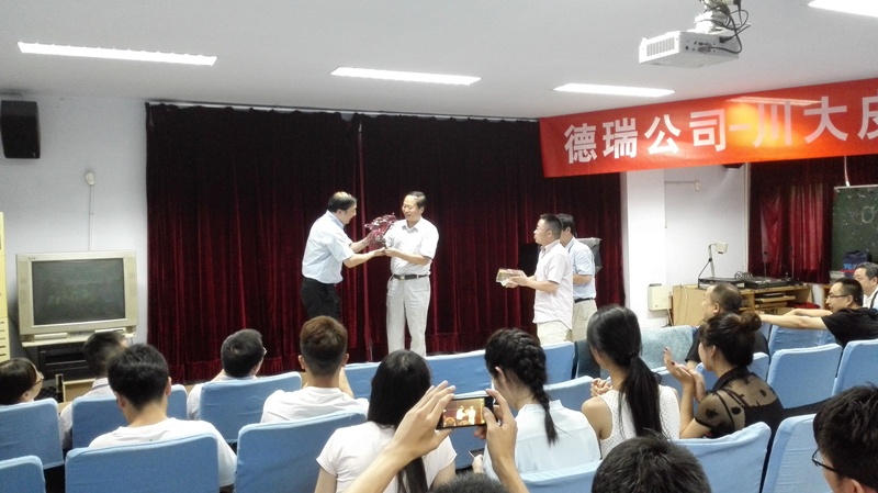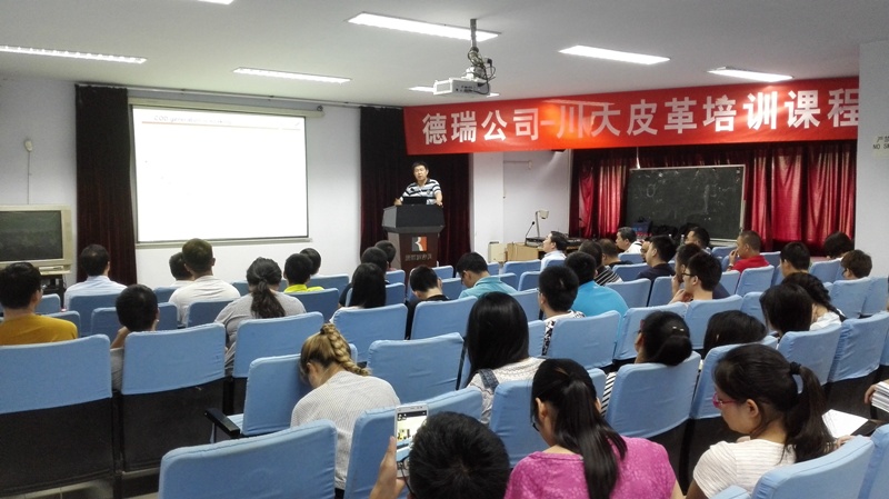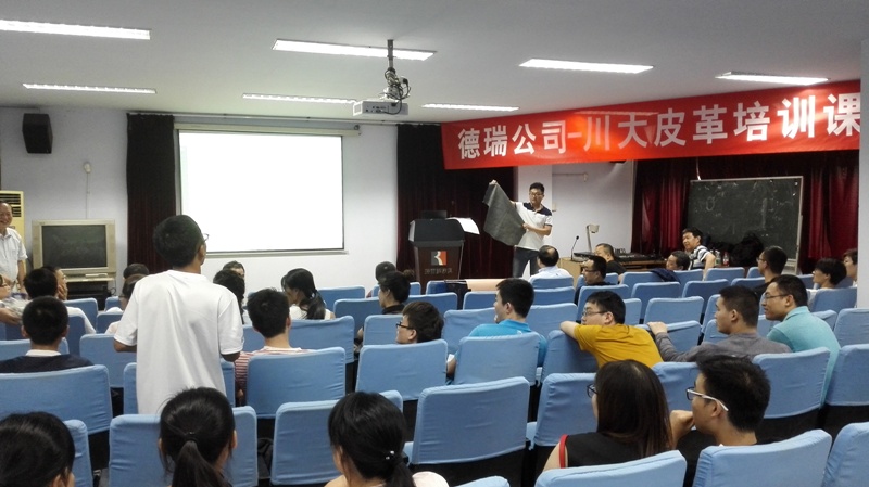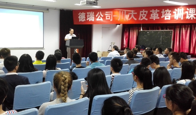 向德瑞公司代表团的到访表示热烈的欢迎,他回顾了德瑞公司与川大皮革系的深厚友谊及在人才培养、技术开发方面的合作历程,重点介绍了德瑞公司在皮革环境友好材料开发应用方面所取得的成就,勉励参与课程的同学能在课程和联谊活动中珍惜难得的机会与德瑞公司代表团成员们积极互动。 德瑞公司销售副总裁徐怀海先生对德瑞公司以及皮革行业做了详细的介绍,强调了皮革行业的发展前景如何有节院长所说的“日不落产业”,认为德瑞的重心在于解决皮革行业所面临的现实问题。随后,德瑞公司技术总监周利军校友、高级技术代表何杰校友以“现代制革业的破局——时尚/环保与传统工艺的融合”为题,对德瑞公司在水场准备工段的解决方案做了详细的介绍,并与现场同学进行了热烈深入的交流互动。培训课程第一单元结束后,参与培训课程的师生利用茶歇时间在皮革楼209会议室参加了德瑞公司最新时尚皮革品种路演活动,并与德瑞代表团成员就感兴趣的皮革品种的制作工艺以及皮革化工材料使用情况进行了热烈的讨论。最后,德瑞代表团对皮革涂饰工艺进行了解析,并和参加培训会的同学对工艺细节进行了讨论,整个过程气氛热烈。活动结束后,德瑞代表团和轻纺与食品成年人电影