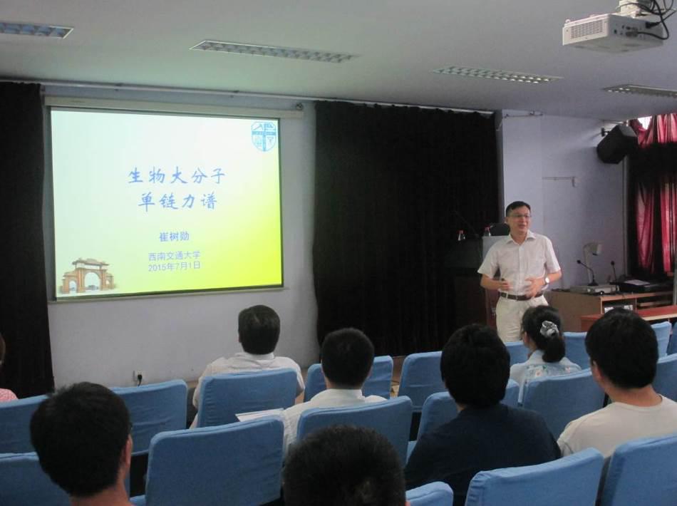 部分师生进行了交流和讨论。崔树勋教授现任职于西南交通大学教授。1995年--2004年在吉林大学求学,先后获学士和博士学位。曾在慕尼黑大学和UC Berkeley从事合作研究。研究兴趣为聚合物纳米力学探测和生命起源及分子进化。先后主持国家自然科学基金项目6项。已在J. Am. Chem. Soc.、Nano Letters、Macromolecules等国际知名期刊发表SCI研究论文40多篇,论文被他人SCI引用460次。2008年荣获中国化学会“青年化学奖”。2011年入选教育部新世纪优秀人才支持计划。2012年获国家自然科学基金委优秀青年科学基金资助。