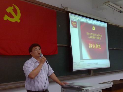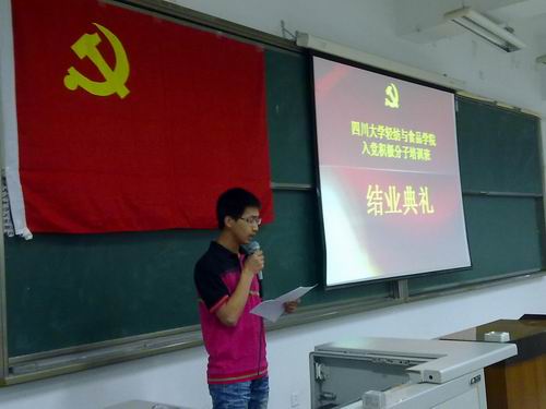 各位老师、各组组长的全力配合表示感谢,也对获得优秀学员的学员表示祝贺。其次,刘书记对本次党课的课程设置及授课教师的情况进行了简单的分析,对本次党校的考试成绩以及考试过程进行了全面的总结。同时,也对所有入党积极分子提出了三点希望:第一、希望每位学员将党校学习作为新的起点,在以后的学习和生活中,继续努力、争创佳绩。第二、希望每位学员坚持理论联系实际,把党的先进性体现在平时的言行之中。第三、希望所有学员在日常学习、工作中起好表率带头作用,以更加严格的标准要求自己,争取早日加入中国共产党。接下来冯国涛老师宣布了本次党校优秀学员名单,并由刘晓虎副书记和李慧老师为优秀学员颁发了荣誉证书。最后,2010级轻化工程专业闫思宇同学代表优秀学员进行了交流发言。