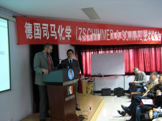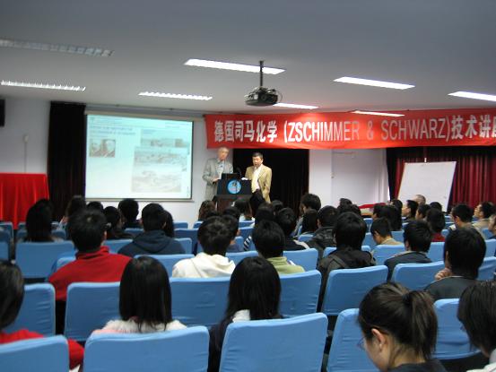 副院长何有节教授、04级辅导员刘健西老师以及轻化工程本科生、研究生共100余人。报告会由何有节教授主持。 Mr. Neumeier首先就德国司马化学有限公司的创立、发展及主要产品给大家作了详细的介绍。Dr.Francke 作了题为Introducing of ZSCHIMMER & SCHWARZ Fatliquoring Agents的报告,对该公司的加脂剂及其他产品的性能、应用做了详细的介绍,并展示了该公司生产的汽车坐垫革,引起了同学们的浓厚兴趣。报告会结束以后, Mr.Neumeier、Dr.Francke、张建华先生等就汽车坐垫革的制革工艺,制革工艺中的环保问题等同学们非常关心的问题进行了详细的交流,同学们提问积极踊跃,现场气氛十分活跃。 德国司马化学有限公司成立于1894年,总部位于德国莱恩斯坦市,公司一直致力于皮革化学品、毛皮化学品、陶瓷化学品、化纤化学品以及各种表面活性剂的开发研究,公司有超过三分之二的销售额来自国外业务。与此同时,公司有自己的一套完备的废水净化设备和技术,履行对环境保护的承诺。