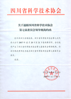 祝贺成年人电影 陈武勇教授当选四川省科学技术协会第七届委员 经中共四川省委批准,四川省科学技术协会第七次代表大会于2007年12月20日~21日在成都召开。会议选举产生了四川省科学技术协会第七届委员会领导机构,成年人电影 陈武勇教授当选为四川省科学技术协会第七届委员会委员。