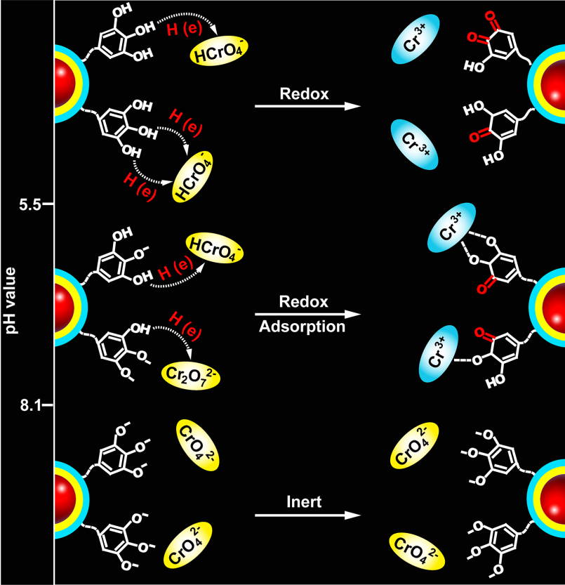 该文以含六价铬(Cr6+)废水为研究对象,传统的静电吸附法处理含六价铬(Cr6+)废水,铬仍以六价的形式存在,并未从根本上解决六价铬的毒性问题,极易造成二次污染。基于此,范浩军教授团队将具有还原性的植物单宁单体-没食子酸共价锚定于表面含伯胺基团的磁性纳米颗粒表面,制备了一种磁响应纳米吸附剂。该吸附材料表面的还原性可通过调节溶液中的pH值得到精确控制,精准地实现了废水中六价铬的还原→配位吸附→磁响应移除全过程。本研究所涉及的磁响应纳米吸附剂在将六价铬从溶液中分离的同时实现了六价铬的“解毒”,从而避免了六价铬治理过程中的二次污染问题。