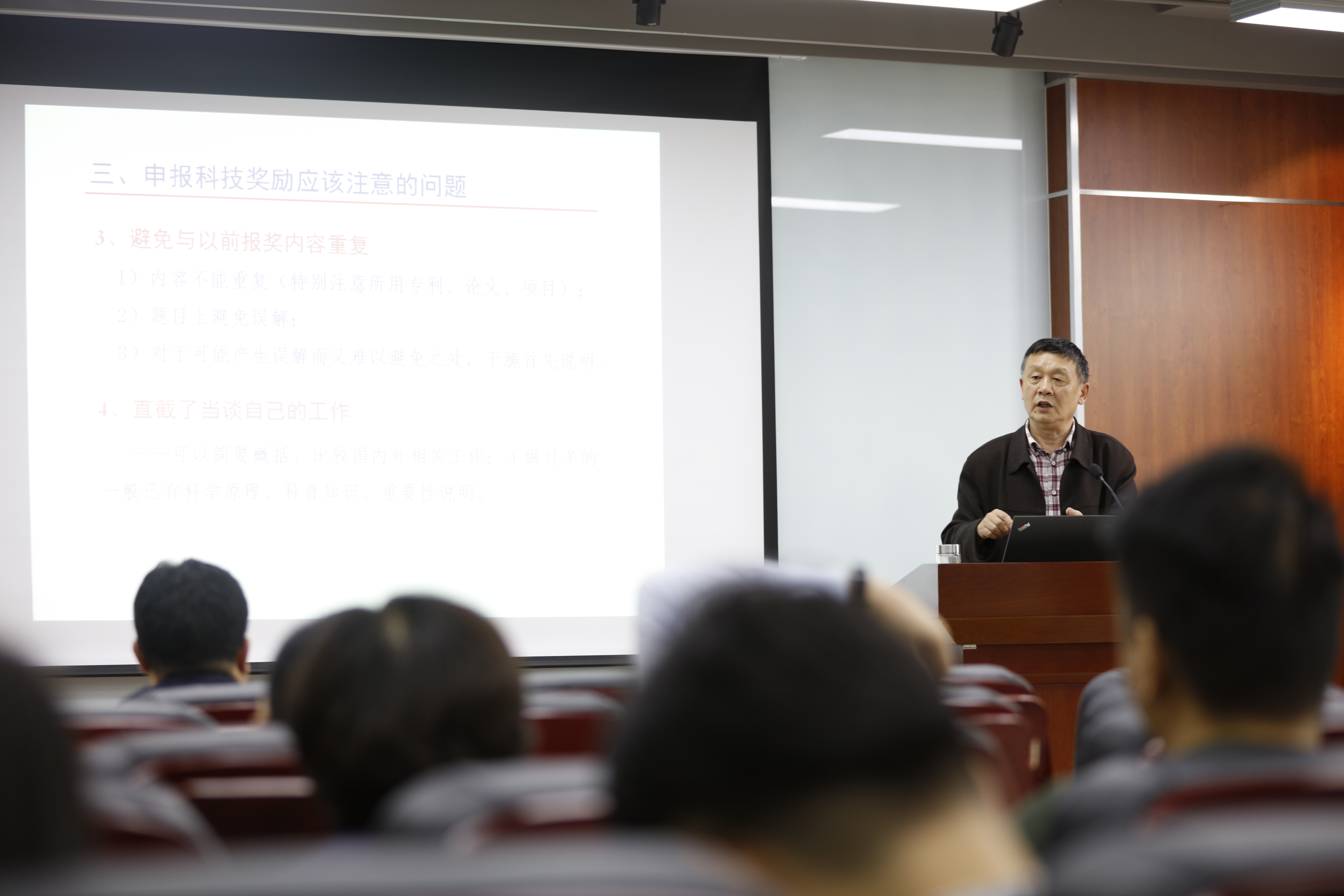 石碧院士首先就学科融合进行发言,倡议全院教职员工都要以主人翁的精神状态,投入到高峰学科的建设之中。并从申报科技奖的意义、评审中的一些变化和申报过程中应该注意的问题等三个方面,深入浅出地作了科技奖申报的体会分享。