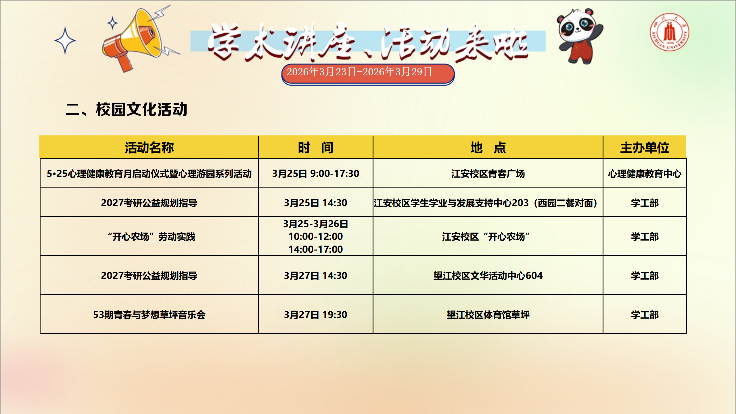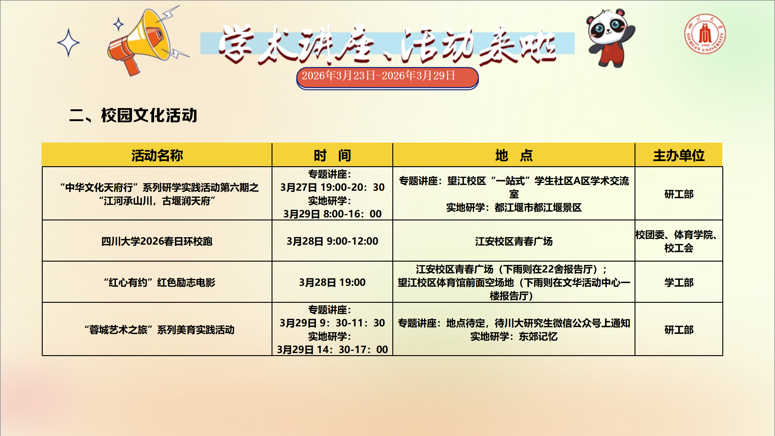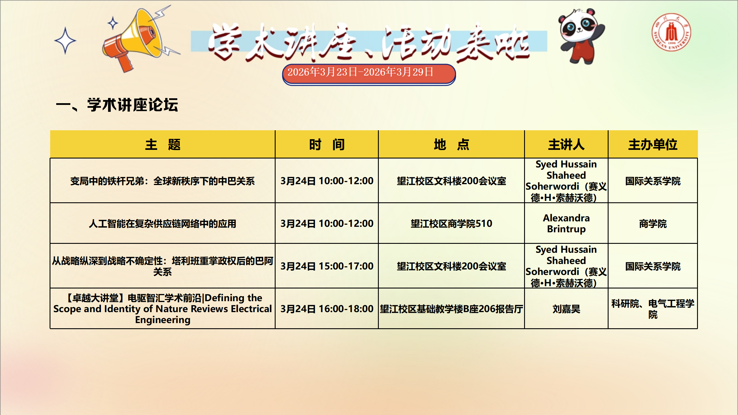 学术讲座与校园文化活动预告(2026年3月23日-2026年3月29日)