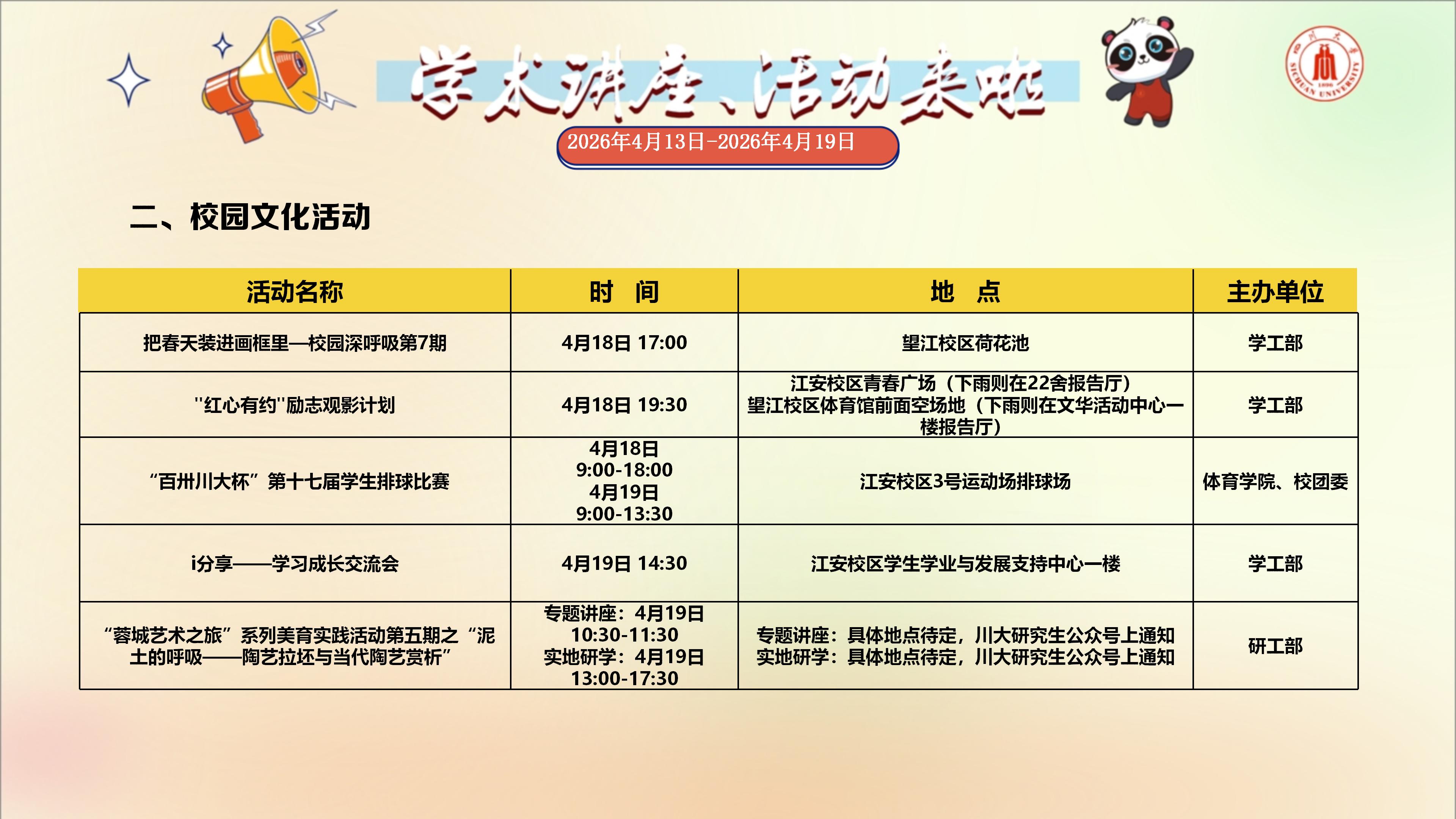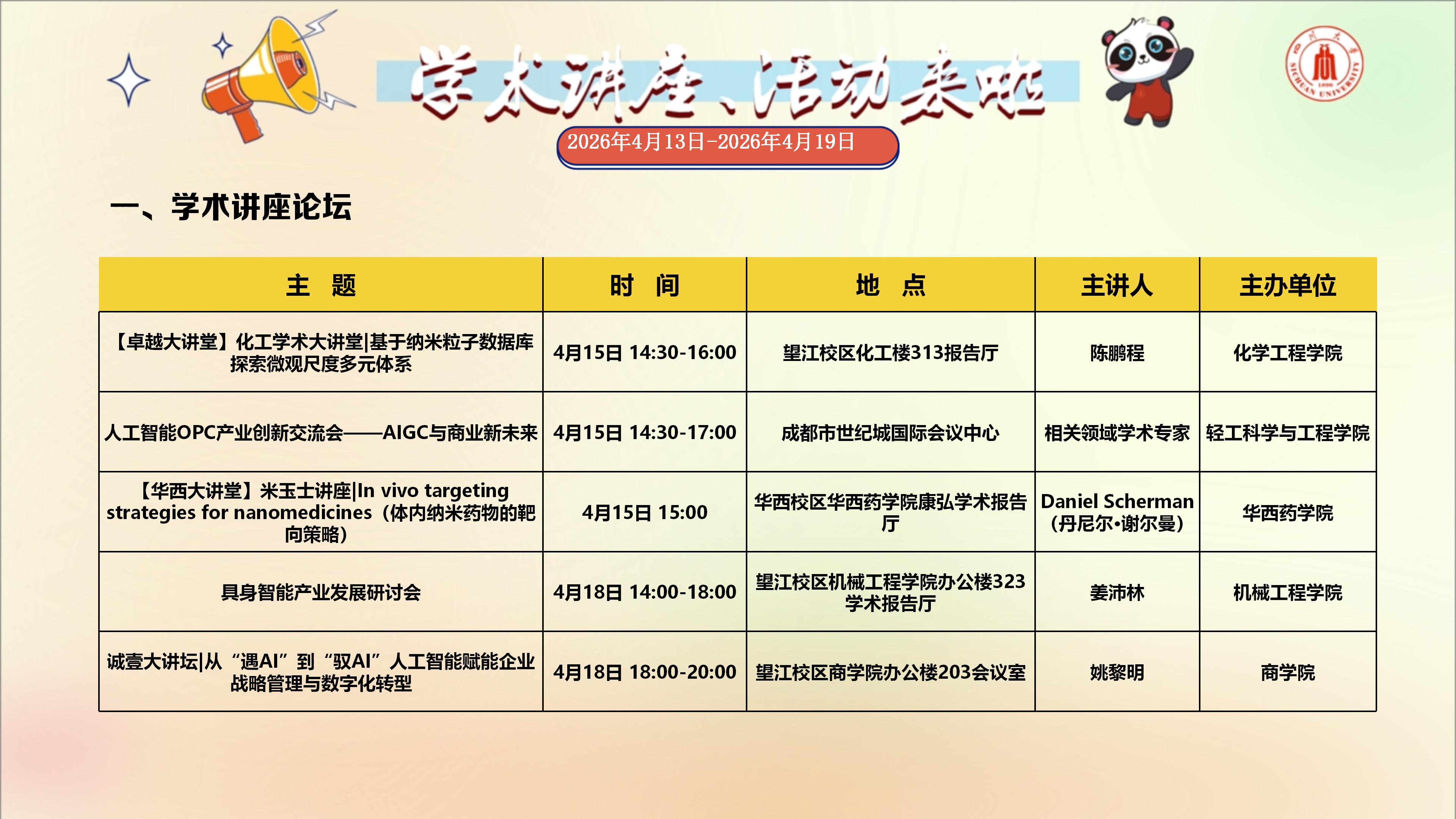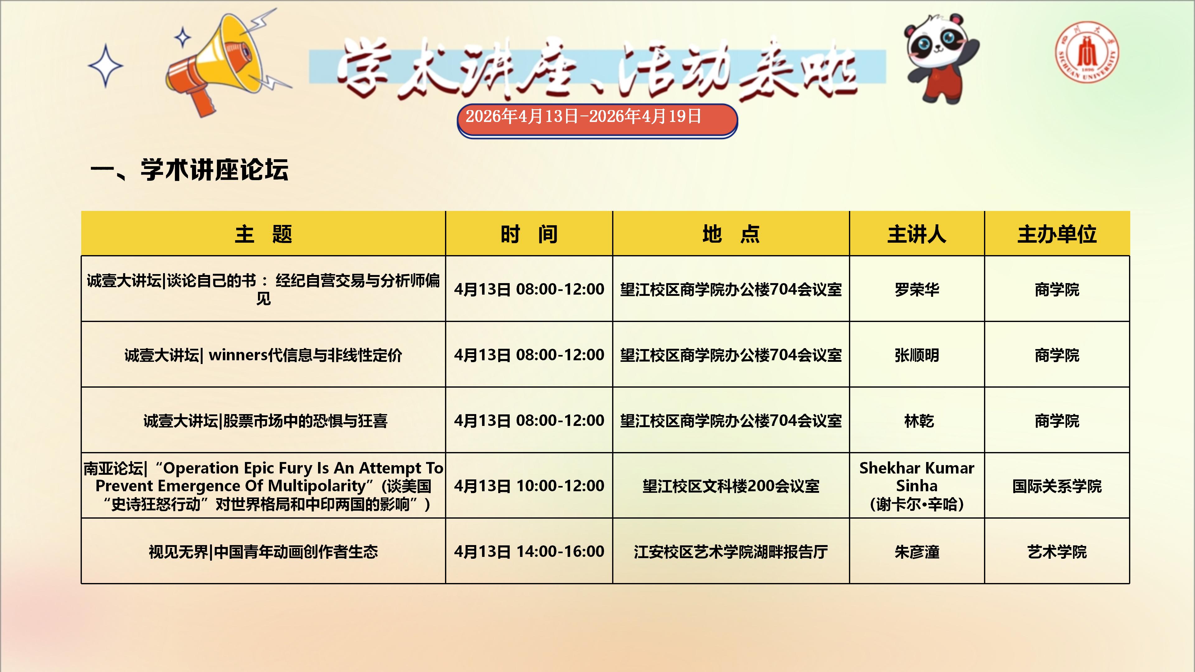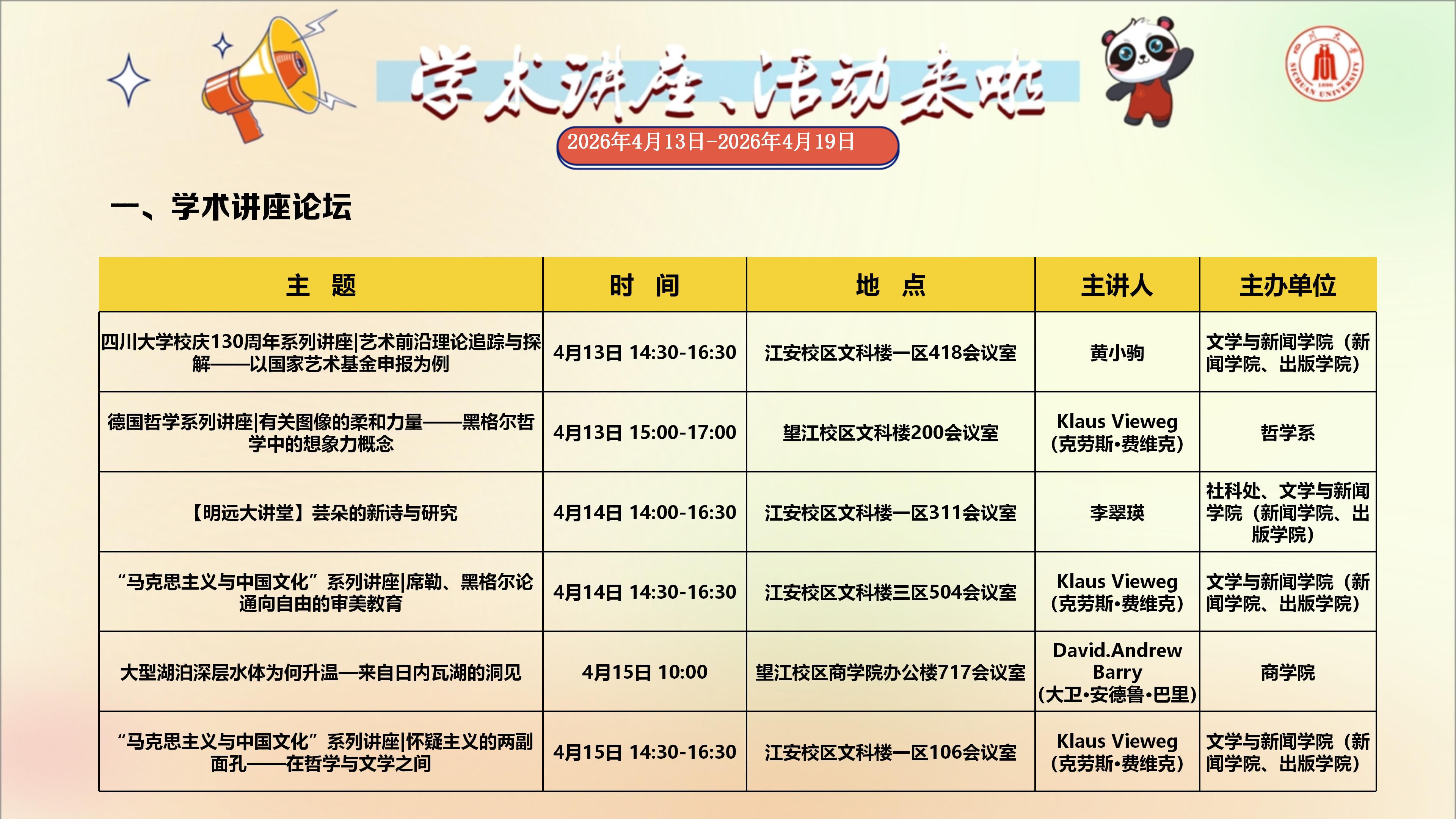 学术讲座与校园文化活动预告(2026年4月13日-2026年4月19日)