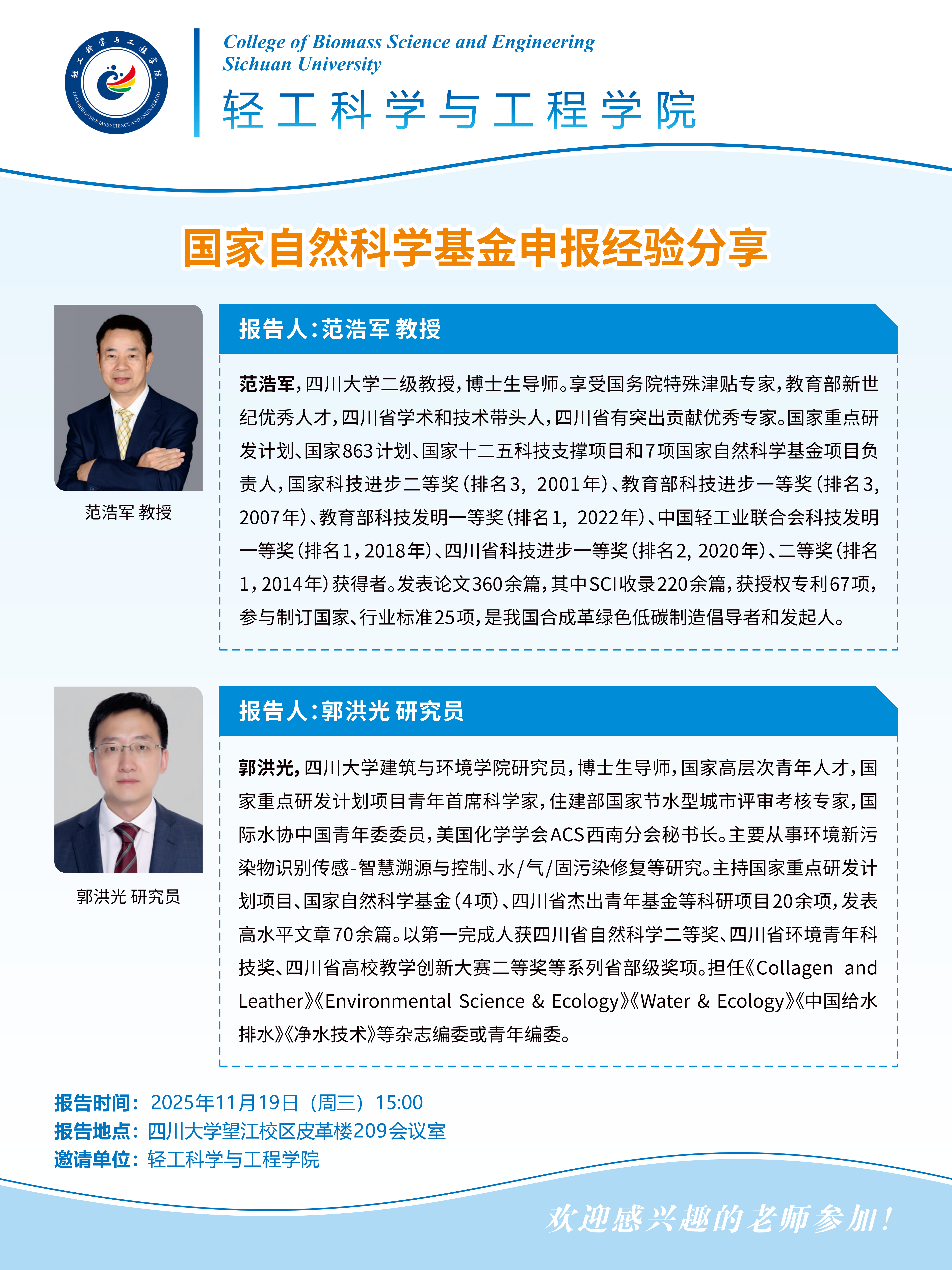 前沿论坛:范浩军教授、郭洪光研究员 11月19日国家自然科学基金申报经验分享