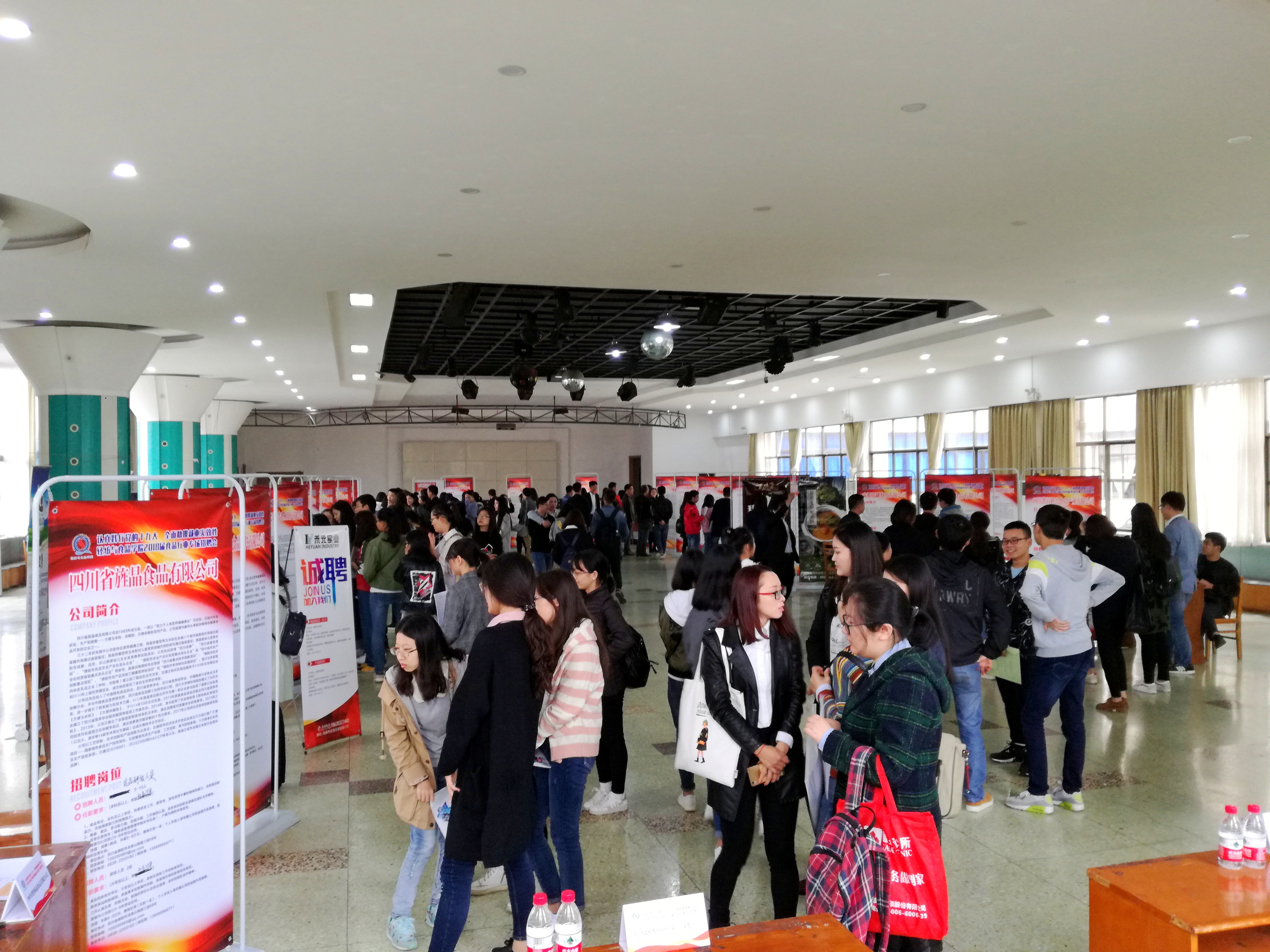 本次专场招聘会共邀请中储粮成都粮食储藏科学研究所、四川郫县豆瓣股份有限公司、四川金宫川派味业股份有限公司、四川徽记食品股份有限公司、四川旌晶食品有限公司等29家食品行业用人单位前来我校进行招聘。近300名成都地区各高校食品等相关专业的2018届毕业生到场应聘。招聘会现场,毕业生对各意向单位进行简历投递和现场交流,进一步了解企业营运状况及招聘需求。来到此次招聘会的不仅有2018届毕业生,还有部分其他年级在校学生前来观摩学习。