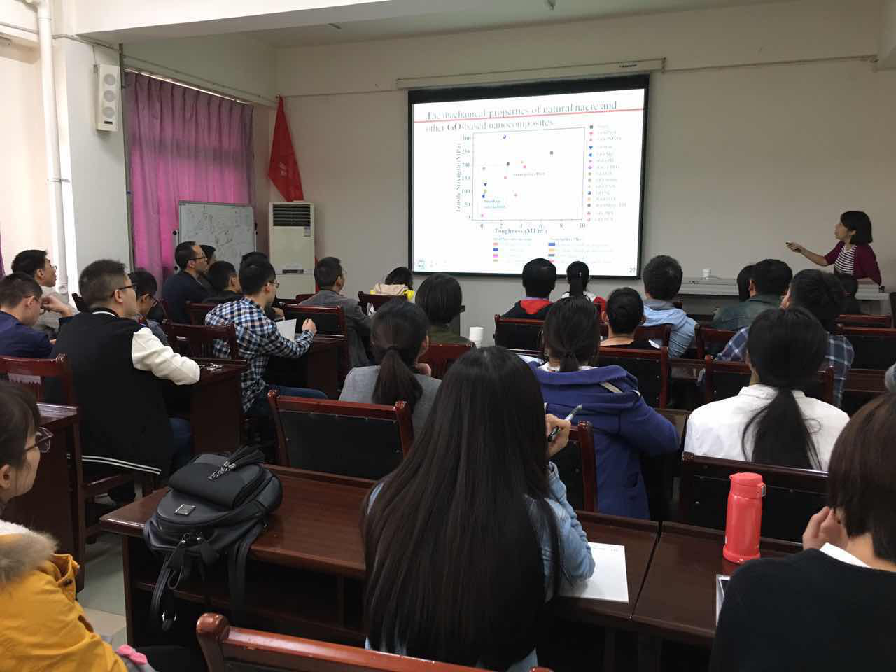 ,在南京大学获高分子化学与物理博士学位,并先后在香港理工大学和宾夕法尼亚大学从事博士后研究和担任访问学者,她的研究兴趣在于石墨烯/高分子功能材料和具有微/纳结构的导电高分子等领域。杨晓明副教授从石墨烯的历史、石墨烯复合物结构的设计及应用等方面开展讲座,报告了她在氧化石墨烯/聚合物层状结构材料的设计、制备及其近红外光响应研究的最新研究结果。杨晓明老师的报告幽默风趣,内容深入浅出,激起了在座老师和学生的浓厚兴趣。讲座期间,师生踊跃发言提问,通过与杨晓明老师面对面的交流,拓宽了成年人电影