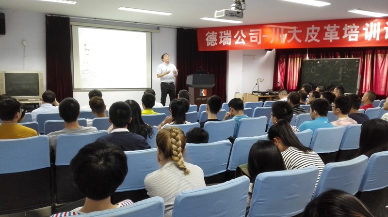 向德瑞公司代表团的到访表示热烈的欢迎,他回顾了德瑞公司与川大皮革系的深厚友谊及在人才培养、技术开发方面的合作历程,重点介绍了德瑞公司在皮革环境友好材料开发应用方面所取得的成就,勉励参与课程的同学能在课程和联谊活动中珍惜难得的机会与德瑞公司代表团成员们积极互动。 德瑞公司销售副总裁徐怀海先生对德瑞公司以及皮革行业做了详细的介绍,强调了皮革行业的发展前景如何有节院长所说的“日不落产业”,认为德瑞的重心在于解决皮革行业所面临的现实问题。随后,德瑞公司技术总监周利军校友、高级技术代表何杰校友以“现代制革业的破局——时尚/环保与传统工艺的融合”为题,对德瑞公司在水场准备工段的解决方案做了详细的介绍,并与现场同学进行了热烈深入的交流互动。培训课程第一单元结束后,参与培训课程的师生利用茶歇时间在皮革楼209会议室参加了德瑞公司最新时尚皮革品种路演活动,并与德瑞代表团成员就感兴趣的皮革品种的制作工艺以及皮革化工材料使用情况进行了热烈的讨论。最后,德瑞代表团对皮革涂饰工艺进行了解析,并和参加培训会的同学对工艺细节进行了讨论,整个过程气氛热烈。活动结束后,德瑞代表团和轻纺与食品成年人电影