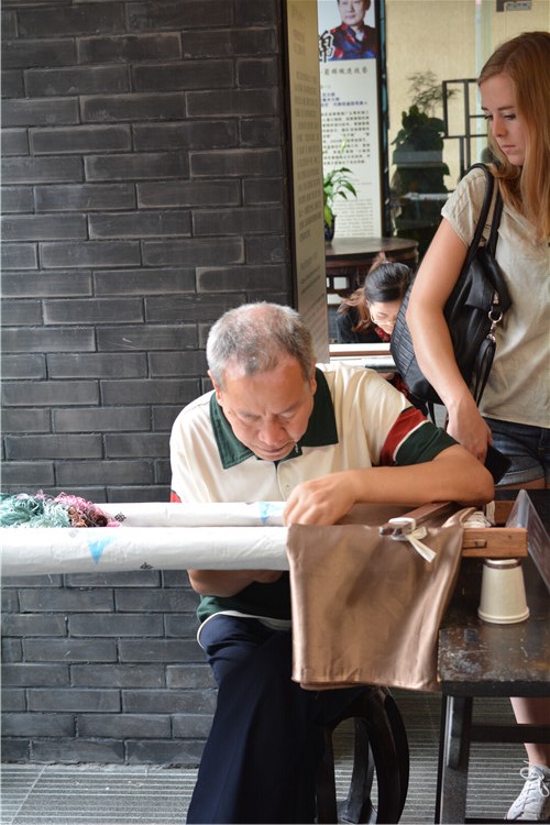 营员们还有幸见到了四川省工艺美术大师彭世平先生,彭大师从事蜀绣技艺研究三十多年,陈列在馆内的双面三异绣作品可谓是巧夺天工。彭大师当时正在创作一幅名为“锦上添花”的作品,他娴熟地穿针引线,技艺娴熟,作品也匠心独具。