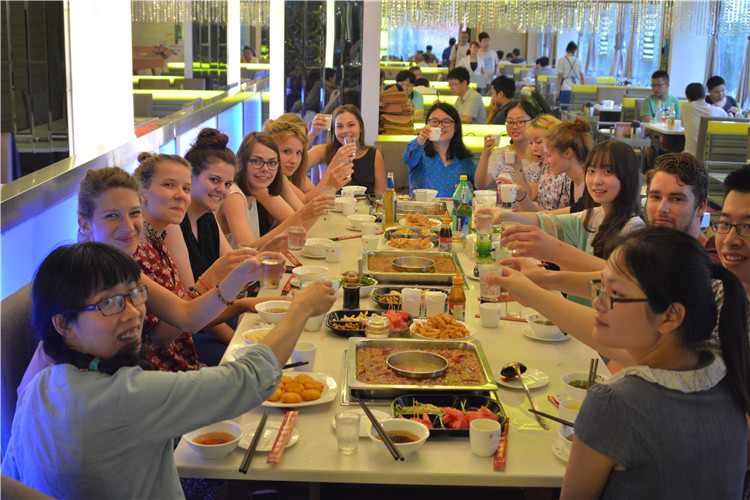 的营员们一边帮助留学生点菜、夹菜,一边还要介绍本地的各种菜品,留学生中的吃货CAS问“皮蛋是啥味道?”让营员们绞尽脑汁,饮食文化才是博大精深,远比白天遇到的各种专业词汇更让人头大。