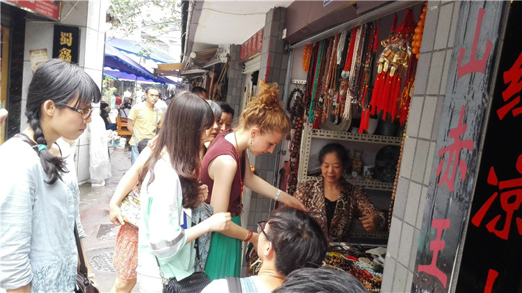 的营员们透露说,这附近就藏着一个宝地——送仙桥古玩艺术城。营员们迅速地结束午餐冲进市场,原定的半小时采购压根儿不够,留学生们见啥都稀奇,有买原石的、有买手串的、有挑瓷器的、还有淘二手书的,足足逛了近两个小时才出来。