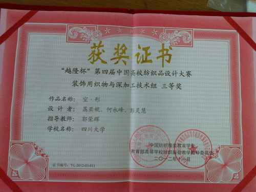 中国纺织服装教育学会主办的“越隆杯”第四届中国高校纺织品设计大赛11月30日圆满结束。大赛面向全国纺织类高校中征集参赛作品,来自东华大学、天津工业大学、浙江理工大学等全国22所相关高校纺织类专业的学生参赛,共征集608件作品,经过由组委会严格筛选,其中33件作品入围决赛,成年人电影 纺织工程专业荔亚妮等同学(指导老师:郭荣辉)的作品《空﹒行》获得装饰用织物与深加工技术组“三等奖”,郭荣辉老师在此次大赛中获得“优秀指导教师”称号。