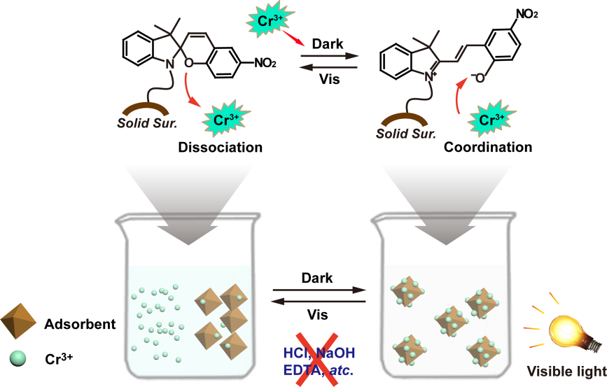 该文以含三价铬(Cr3+)的制革废水为研究对象,传统的吸附法处理包括功能吸附剂的合成、吸附应用以及吸附剂脱附再生并循环利用等环节。而针对吸附剂的再生利用,前人大量的研究都是通过加入酸、碱或螯合剂以改变吸附剂表面的电荷或提高竞争关系从而使被吸附的三价铬从吸附剂表面脱附,这种解吸方法所引入的酸、碱或螯合物必然会造成二次污染,也会造成吸附剂的使用效率降低。基于此,范浩军教授团队合成了一种光敏化合物—螺吡喃,并将此化合物共价固定于固体基材表面制备成吸附材料。将此吸附材料应用于废水中三价铬的吸附,吸附结束后利用可见光照射实现三价铬的脱附并循环利用,不再需要加入酸、碱或其他物质脱附,从源头上杜绝了酸、碱或其它化学物质的二次污染,向生态环保和可持续发展又迈进了一步。
