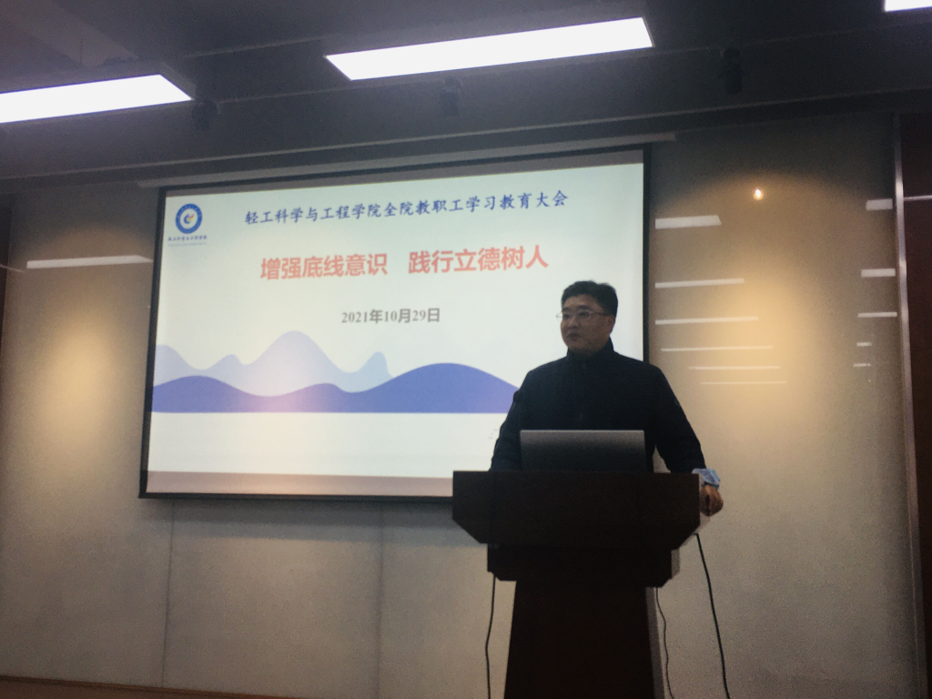 在皮革楼215报告厅召开了全院教职工学习教育大会。全体教职工出席会议;何有节院长主持会议。