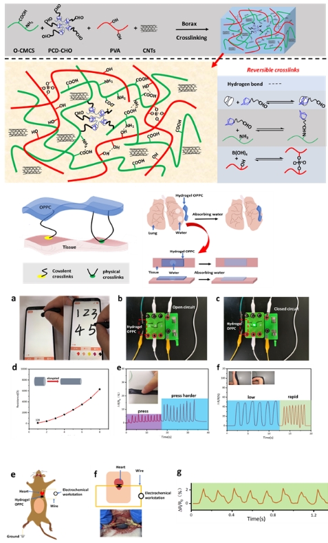 该团队后续又以羧甲基壳聚糖和β-环糊精等为基材,碳纳米管(CNTs)为填充物和主要导电物质制备了双网络水凝胶(硼酸酯键和Schiff base交联)。该水凝胶具有快速的自愈性、极高的自愈率(99%)、良好的机械性能及拉伸性、良好的细胞相容性和较高的灵敏性。此外,该水凝胶具有超高吸水率,可快速吸收湿组织表面的水分膨胀从而与组织形成良好的黏附作用。该双网络水凝胶通过组装成柔性传感器后除了用于监测人体的宏观运动外,还能很精确地贴附在小白鼠心脏(体内)监测其跳动(图3)。相关研究成果以成年人电影