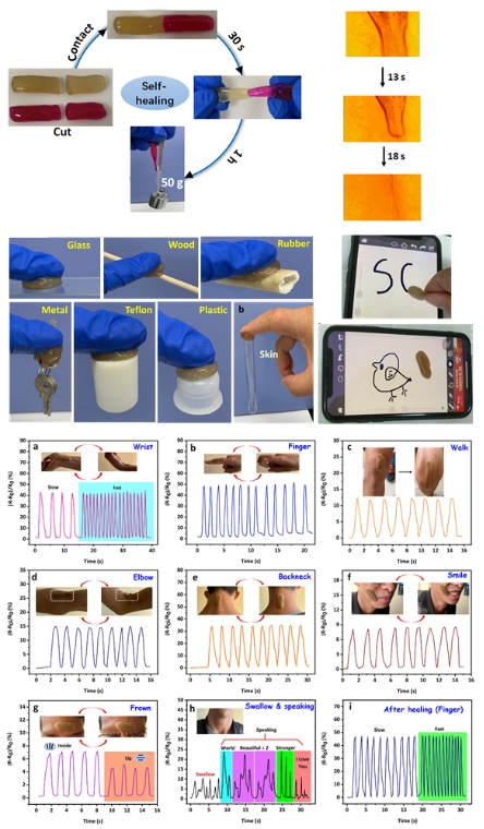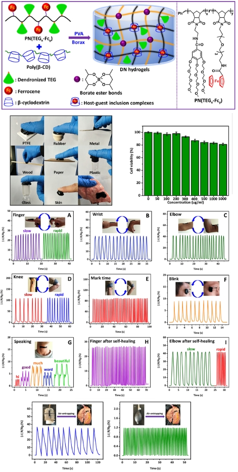 该研究团队以明胶、β-环糊精和PVA等为原料制备了双网络(主-客体作用和硼酸酯键)的水凝胶柔性传感器。该水凝胶传感器表现出更好地机械性能和更高的自愈率(>95%),以及较好的应变敏感性,除了能监测人体的运动外,还能监测体外模拟的猪肺呼吸情况(图2)。相关研究成果以成年人电影
