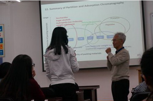 在讲座过程中,山口五十磨教授为大家详细的讲述了有关色谱的基础知识,内容丰富,讲解过程中与同学们进行互动,耐心解答了同学们的疑惑,讲座的整个过程轻松和谐。在山口五十磨教授耐心的讲解下,本次讲座顺利结束,并获得了大家的好评。讲座结束后,同学们还积极与教授进行交流,收获颇多。(食品系研究生张华玲撰稿)